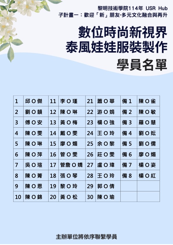 數位時尚新視界泰風娃娃服裝製作 學員名單